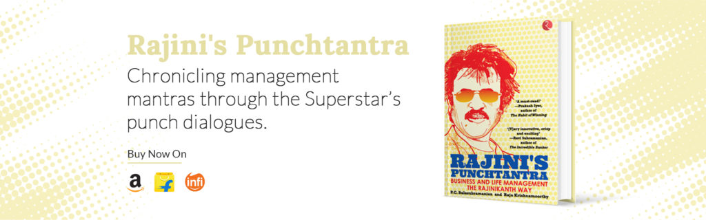 This book lists 30 top punch dialogues from Rajini movies. The authors PCBalasubramanian and Raja Krishnamoorthy then relate these punch lines with business and life management in an absolute creative way. These piece of wisdom is a great insight into personal and business mastery.